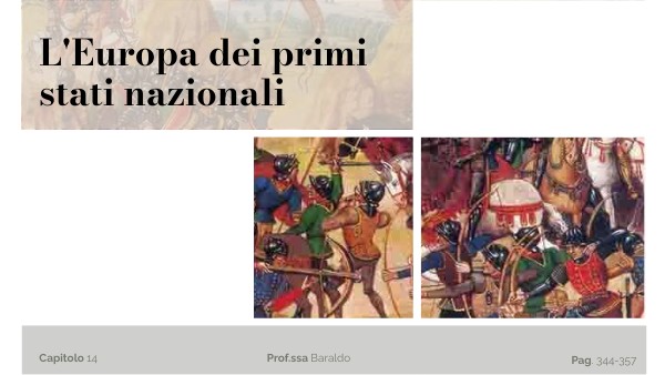La formazione delle monarchie nazionali è accompagnata da guerre. La guerra dei cent'anni (1337-1453) contrappone Francia e Inghilterra. All'inizio l'esercito francese ha la peggio, ma - anche grazie all'intervento di Giovanna d'Arco, che ritiene di essere ispirata da Dio - alla fine riesce a sconfiggere gli Inglesi, che rinunciano ai loro territori sul continente. In Inghilterra le famiglie di Lancaster e di York si battono per la successione al trono nella guerra delle due rose (1455-1485). Al termine della guerra viene incoronato re Enrico VII Tudor, capo dei Lancaster e marito di Elisabetta di York.
