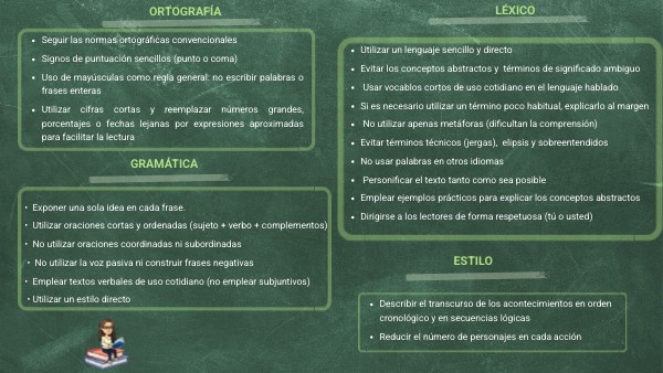• Exponer una sola idea en cada frase.• Utilizar oraciones cortas y ordenadas (sujeto + verbo + complementos)• No utilizar oraciones coordinadas ni subordinadas • No utilizar la voz pasiva ni construir frases negativas • Emplear textos verbales de uso cotidiano (no emplear subjuntivos) • Utilizar un estilo directo