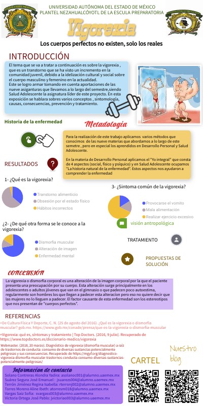 El tema que se va a tratar a continuación es sobre la vigorexia , que es un transtorno que se ha visto un incremento en la comunidad juvenil, debido a la idelización cultural y social sobre el cuerpo masculino y femenino en la actualidad. Este se logro armar tomando en cuenta aportaciones de las nueve asiganturas que llevamos a lo largo del semestre,siendo Salud Adolescente la asignatura líder de este proyecto. En esta exposición se hablara sobres varios conceptos , sintomología, causas, consecuencias, prevención y tratamiento.
