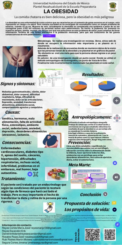 La obesidad es una enfermedad de curso crónico que se caracteriza por el aumento de grasa excesiva en el cuerpo, esto representa un riesgo a la salud. Pero nuestra sociedad se ha encargado de normalizarla como un simple problema de estética, cuando no es así. Muestra de esto, actualmente la obesidad es considerada una epidemia a pesar de no ser contagiosa pues 4,000 mil millones de personas sufren este padecimiento. De hecho, la podemos ver presente en nuestros amigos, familia, vecinos, etc. Es por eso que nos enfocamos en este problema de salud, pues tratamos de llevar información verídica de una forma interactiva a la población mexicana, para que sea consciente de las graves consecuencias de este padecimiento.