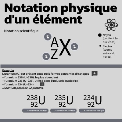Exemple L'uranium (U) est présent sous trois formes courantes d'isotopes : - l'uranium 238 (U-238), le plus abondant ; - l'uranium 235 (U-235), utilisé dans l'industrie nucléaire ; - l'uranium 234 (U-234). L'uranium possède 92 protons.