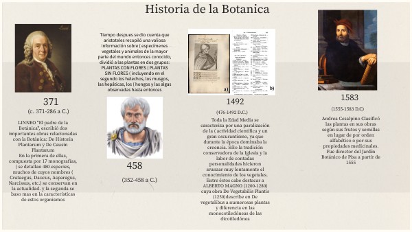 LINNEO "El padre de la Botánica", escribió dos importantes obras relacionadas con la Botánica: De Historia Plantarum y De Causin Plantarum En la primera de ellas, compuesta por 17 monografías, ( se detallan 480 especies, muchos de cuyos nombres ( Crataegus, Daucus, Asparagus, Narcissus, etc.) se conservan en la actualidad. y la segunda se baso mas en la caracteristicas de estos organismos