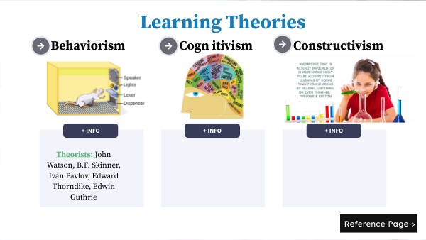 Andreev, I. (2032, June 17). Coginitve learning. Valamis. https://www.valamis.com/hub/cognitive-learning Clark, K. R. (2018). Learning theories: behaviorism. Radiologic Technology, 90(2), 172–175. Clark, K. R. (2018). Learning theories: cognitivism. Radiologic Technology, 90(2), 176–179. Clark, K. R. (2018). Learning theories: Constructivism. Radiologic Technology, 90(2), 180–182. Lynch, M. (2018, August 14). What is coginitive learning?. The Tech Edvocate. https://www.thetechedvocate.org/what-is-cognitive-learning/ Mangelschots, K. (2022, January 31). What is memory: the role of memory in learning. Healthy Body at Home. https://healthybodyathome.com/what-is-memory-the-role-of-memory-in-learning/ McLeod, S. A., (2017, February 5). Behaviorist approach. Simply Psychology. https://www.simplypsychology.org/behaviorism.html