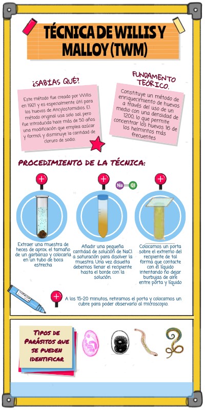 Este método fue creado por Willis en 1921 y es especialmente útil para los huevos de Ancylostomidios. El método original usa solo sal, pero fue introducida hace más de 50 años una modificación que emplea azúcar y formol, y disminuye la cantidad de cloruro de sodio.