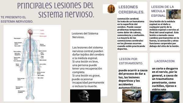 Lesiones del Sistema Nervioso. Las lesiones del sistema nervioso central pueden dañar tejidos del cerebro o la médula espinal. Si una lesión es leve, una persona puede tener una recuperación completa. Si una lesión es grave, puede ocasionar incapacidad permanente o incluso la muerte.