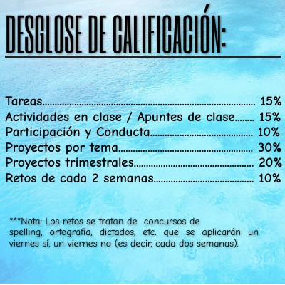 Tareas....................................................................................... 15% Actividades en clase / Apuntes de clase........ 15% Participación y Conducta.......................................... 10% Proyectos por tema....................................................... 30% Proyectos trimestrales................................................. 20% Retos de cada 2 semanas......................................... 10%