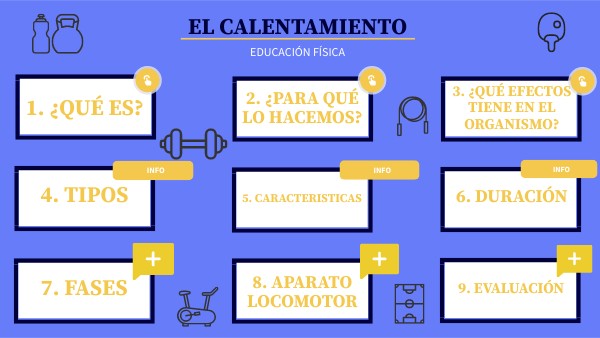 Conjunto de ejercicios que se realizan previo a una actividad física. El calentamiento nos sirve como puente que facilita el paso de un estado de reposo a un estado de actividad física media o alta. Cada sesión de entrenamiento o clase de educación física esta divida en 3 partes. Cada una de ellas con una función específica y un tiempo determinado. Estas partes son: - Calentamiento. - Parte principal. - Vuelta a la calma.