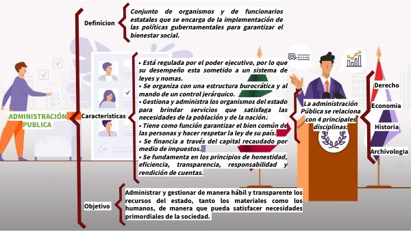 • Está regulada por el poder ejecutivo, por lo que su desempeño esta sometido a un sistema de leyes y nomas. • Se organiza con una estructura burocrática y al mando de un control jerárquico. • Gestiona y administra los organismos del estado para brindar servicios que satisfaga las necesidades de la población y de la nación. • Tiene como función garantizar el bien común de las personas y hacer respetar la ley de su país. • Se financia a través del capital recaudado por medio de impuestos. • Se fundamenta en los principios de honestidad, eficiencia, transparencia, responsabilidad y rendición de cuentas.