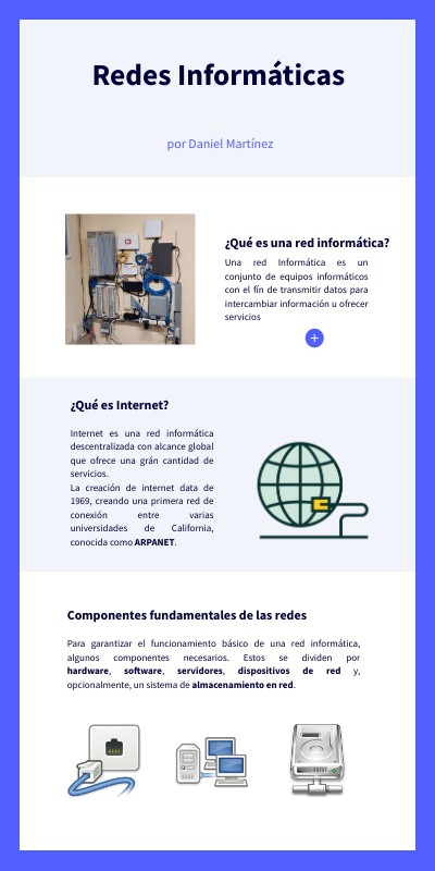 Internet es una red informática descentralizada con alcance global que ofrece una grán cantidad de servicios. La creación de internet data de 1969, creando una primera red de conexión entre varias universidades de California, conocida como ARPANET.