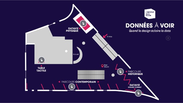Circulant autour de l’œuvre, les visiteurs sont invités à interroger la carte à travers le prisme des données de l’Institut matérialisées par des panneaux en plexiglass de couleur. Grâce au jeu de transparence et d’ombres colorées, les données viennent physiquement « éclairer » notre lecture du territoire.