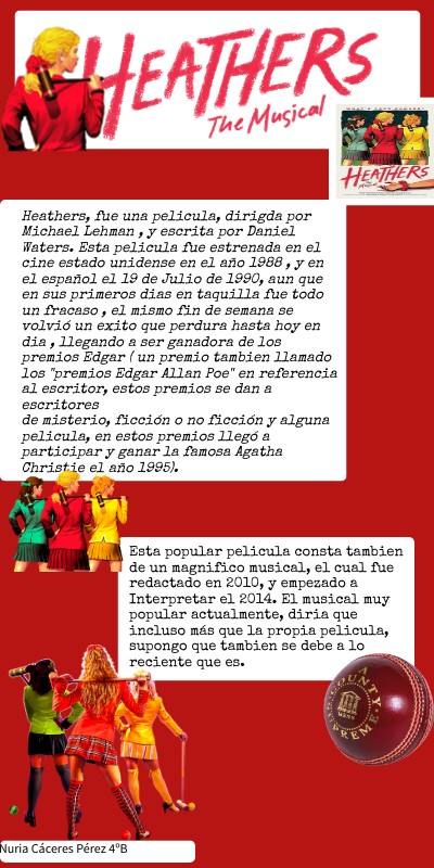 Heathers, fue una pelicula, dirigda por Michael Lehman , y escrita por Daniel Waters. Esta pelicula fue estrenada en el cine estado unidense en el año 1988 , y en el español el 19 de Julio de 1990, aun que en sus primeros dias en taquilla fue todo un fracaso , el mismo fin de semana se volvió un exito que perdura hasta hoy en dia , llegando a ser ganadora de los premios Edgar ( un premio tambien llamado los "premios Edgar Allan Poe" en referencia al escritor, estos premios se dan a escritores de misterio, ficción o no ficción y alguna pelicula, en estos premios llegó a participar y ganar la famosa Agatha Christie el año 1995).