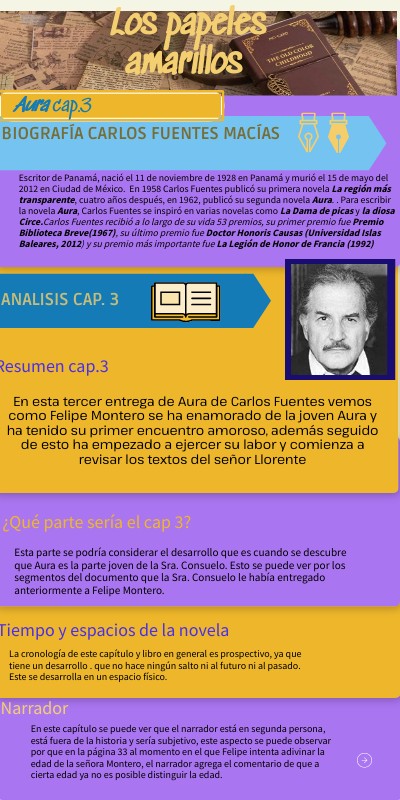 En esta tercer entrega de Aura de Carlos Fuentes vemos como Felipe Montero se ha enamorado de la joven Aura y ha tenido su primer encuentro amoroso, además seguido de esto ha empezado a ejercer su labor y comienza a revisar los textos del señor Llorente