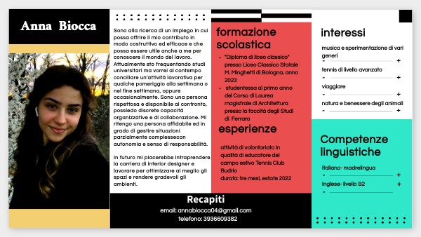 Sono alla ricerca di un impiego in cui possa offrire il mio contributo in modo costruttivo ed efficace e che possa essere utile anche a me per conoscere il mondo del lavoro. Attualmente sto frequentando studi universitari ma vorrei al contempo conciliare un'attività lavorativa per qualche pomeriggio alla settimana o nel fine settimana, oppure occasionalmente. Sono una persona rispettosa e disponibile al confronto, possiedo discrete capacità organizzative e di collaborazione. Mi ritengo una persona affidabile ed in grado di gestire situazioni parzialmente complessecon autonomia e senso di responsabilità. In futuro mi piacerebbe intraprendere la carriera di interior designer e lavorare per ottimizzare al meglio gli spazi e rendere gradevoli gli ambienti.