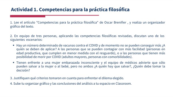 1. Lee el artículo "Competencias para la práctica filosófica" de Oscar Brenifier , y realiza un organizador gráfico del texto. 2. En equipo de tres personas, aplicando las competencias filosóficas revisadas, discutan uno de los siguientes escenarios:
