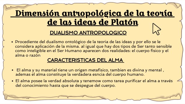 - Procediente del dualismo ontológico de la teoria de las ideas y por ello se le considera aplicación de la misma. al igual que hay dos tipos de Ser tanto sensible como inteligible en el Ser Humano aparecen dos realidades: el cuerpo fisico y el alma o razón