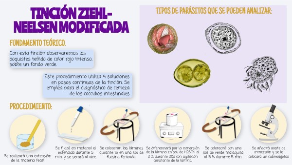 Este procedimiento utiliza 4 soluciones en pasos continuos de la tinción. Se emplea para el diagnóstico de certeza de los coccidios intestinales