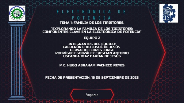 Tema 1: Familia de los tiristores."Explorando la familia de los Tiristores: Componentes clave en la electrónica de potencia" EQUIPO 2 INTEGRANTES DEL EQUIPO: CALDERÓN CHIU JOSUÉ DE JESÚS GERVACIO FLORES JORGERODRíGUEZ GONZÁLEZ CRISTIAN ANTONIOUSCANGA DÍAZ dARÍAN DE JESÚS M.C. Hugo Abraham Pacheco Reyes FECHA DE PRESENTACIÓN: 15 DE SEPTIEMBRE DE 2023