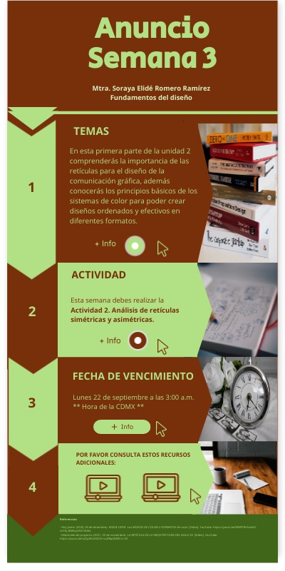 Referencias:- Hey Jaime. (2020, 29 de diciembre). RGB & CMYK. Los MODOS DE COLOR o FORMATOS de color. [Video]. YouTube. https://youtu.be/WNRTBrXvw6s?si=hb_BMAvjnAGT4Odv - Materiales de proyecto. (2021, 25 de noviembre). LA RETÍCULA EN LA ARQUITECTURA DEL SIGLO XX. [Video]. YouTube. https://youtu.be/luDjzAKn0lQ?si=vuifBq4D8ZCx-r2Z