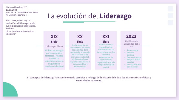 Mariana Mendoza 2°C 13/09/2023 TALLER DE COMPETENCIAS PARA EL MUNDO LABORAL I Flor. (2023, marzo 15). La evolución del liderazgo desde sus inicios hasta nuestros días. RedNew. https://rednew.es/evolucion-liderazgo/