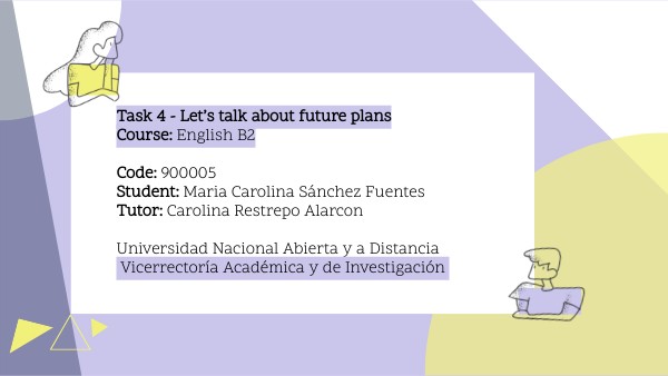 Task 4 - Let’s talk about future plans Course: English B2 Code: 900005 Student: Maria Carolina Sánchez Fuentes Tutor: Carolina Restrepo Alarcon Universidad Nacional Abierta y a Distancia Vicerrectoría Académica y de Investigación