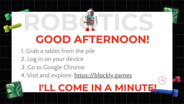 1. Grab a tablet from the pile2. Log in on your device 3. Go to Google Chrome 4. Visit and explore: https://blockly.games
