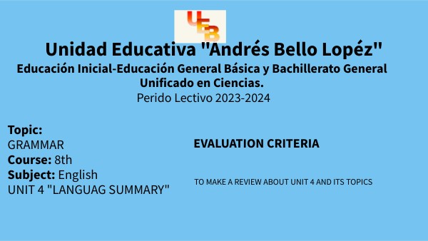 Topic: GRAMMAR Course: 8th Subject: English UNIT 4 "LANGUAG SUMMARY"