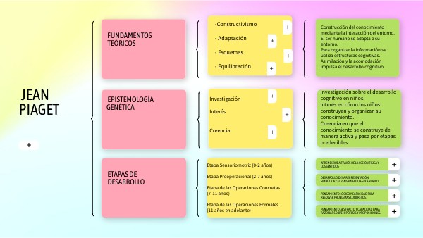 Construcción del conocimiento mediante la interacción del entorno. El ser humano se adapta a su entorno.Para organizar la información se utiliza estructuras cognitivas. Asimilación y la acomodación impulsa el desarrollo cognitivo.