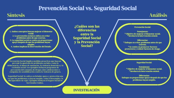 Prevención Social: Implica medidas proactivas que buscan prevenir la aparición de problemas sociales, como la delincuencia, el abuso de sustancias, la violencia doméstica y la exclusión social. Los ejemplos incluyen programas de prevención del consumo de drogas entre adolescentes o campañas de sensibilización contra la violencia de género. Seguridad Social: Se enfoca en brindar apoyo y protección una vez que los problemas ya hayan surgido, como el desempleo, la discapacidad o la vejez. Ejemplos incluyen el Seguro Social en los Estados Unidos.