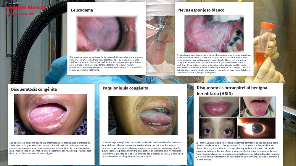 La HBID es una afección de herencia autosómica dominante que se distingue por la presencia de lesiones en la boca y los ojos. En las lesiones bucales, se observan placas blancas y onduladas en la mucosa bucal y los labios. Por otro lado, en la conjuntiva bulbar, se forman placas gruesas desde una etapa temprana de la vida. No se recomienda ningún tratamiento para las lesiones en la boca. Para la evaluación y el tratamiento de las lesiones en la conjuntiva, se recomienda derivar al paciente a un oftalmólogo.