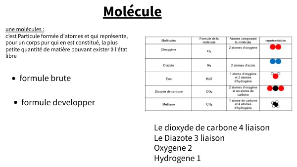 une molécules : c’est Particule formée d'atomes et qui représente, pour un corps pur qui en est constitué, la plus petite quantité de matière pouvant exister à l'état libre
