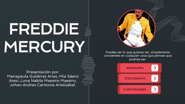 Nacido como Farrokh Bulsara, fue un cantante y compositor britanico de origen parsi que alcanzo la fama por ser vocalista y pianista de Queen. En 4 de febrero de 1954 fue enviado con su abuela y su tia a un internado en Reino Unido, donde se le empezo a conocer como Freddie. Su talento fue observado por el decano que le sugirio a los padres que tomara clases de música y ahí obtuvo el cuarto nivel de piano, y termino su educación en St. Mary´s School, en Bombay. Antes de Queen estuvo en otros grupos como los The Hectics. La pareja de Freddie, Jim Hutton comento en una entrevista que le diagnosticaron SIDA despues de la pascua de 1987. A principios de los 70 comenzo a darse cuenta de su orientación sexual, en la entrevista que hizo en 1974 se declaro "gay como un narciso".