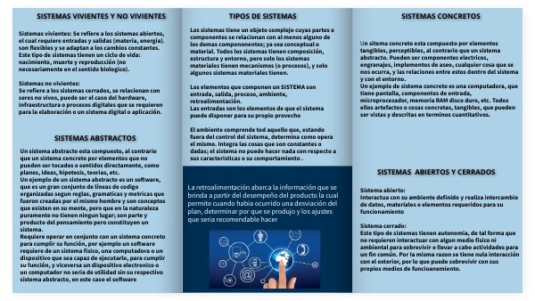 Sistemas vivientes: Se refiere a los sistemas abiertos, el cual requiere entradas y salidas (materia, energia). son flexibles y se adaptan a los cambios constantes. Este tipo de sistemas tienen un ciclo de vida: nacimiento, muerte y reproducción (no necesariamente en el sentido biologico). Sistemas no vivientes: Se refiere a los sistemas cerrados, se relacionan con seres no vivos, puede ser el caso del hardware, infraestructura o procesos digitales que se requieren para la elaboración o un sistema digital o aplicación.