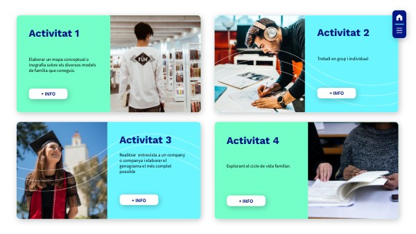 Fase 1: Introducció al Cicle de Vida Familiar Existeixen tres etapes del cicle familiar, i dedins aquestes tres, n'existeixen set més en total. A continuació treballareu en equip per descobrir quines són aquestes etapes i a continuació us dividireu les etapes del cicle de vida i cada un es convertirà en expert en aquella etapa. - Investigació de l'etapa assignada i recopliació d'informació. Fase 2: Investigació i anàlisis Els estudiants profunditzen en les seves respectives etapes del cicle de vida familiar, investigant els canvis i desafiaments. Cada persona exposa la seva etapa perquè tothom aprengui totes les etapes.