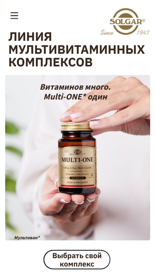 Solgar предоставляет возможность сформировать прочный ресурс для поддержки своего здоровья путем ежедневного употребления одного из представленных комплексов