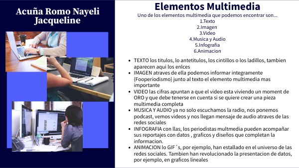 Uno de los elementos multimedia que podemos encontrar son... 1.Texto 2.Imagen 3.Video 4.Musica y Audio 5.Infografia 6.Animacion