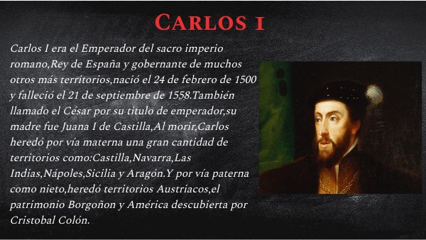 Carlos I era el Emperador del sacro imperio romano,Rey de España y gobernante de muchos otros más territorios,nació el 24 de febrero de 1500 y falleció el 21 de septiembre de 1558.También llamado el César por su titulo de emperador,su madre fue Juana I de Castilla,Al morir,Carlos heredó por vía materna una gran cantidad de territorios como:Castilla,Navarra,Las Indias,Nápoles,Sicilia y Aragón.Y por vía paterna como nieto,heredó territorios Austriacos,el patrimonio Borgoñon y América descubierta por Cristobal Colón.