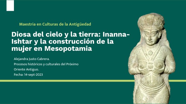 -Estado de los estudios sobre las mujeres en Próximo Oriente Antiguo. - Complejidad de la figura de Inanna-Ishtar: dualidad. - Un culto con presencia en toda Mesopotamia. -El estudio de mitología como un sistema de símbolos para el orden terrenal. -¿Inanna y la construcción de la mujer?