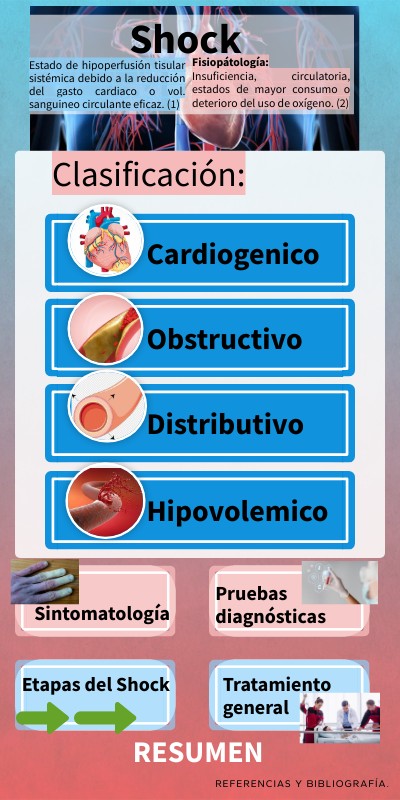 1. Robins. Trastornos hemodinámicos, enferemedad tromboembólica y shock. In: Patología estructural y funcional. 9th ed. KUMAR ABBAS ASTER; 2015. p. 131–4. 2. Taddey W. Shock. In: Semiología medica Argente. 2nd ed. 2013. p. 472–8. 3. Elsevier Connect. Clasificación del shock: sus cinco tipos y las causas subyacentes. Elsevier. 2017 Nov 7; 4. Vera O. SHOCK: Enfoque diagnóstico y terapéutico en el adulto. Scielo. 2007 Jul;52(2).