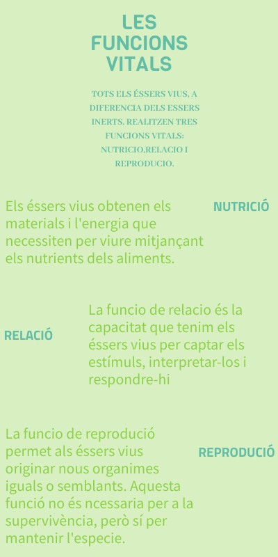 tots Els éssers vius, a diferencia dels essers inerts, realitzen tres funcions vitals: nutricio,relacio i reproducio.