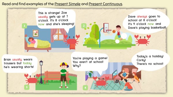 Time expressions: now, right now, at the moment, today, this week, these days, Look!/Listen! ...