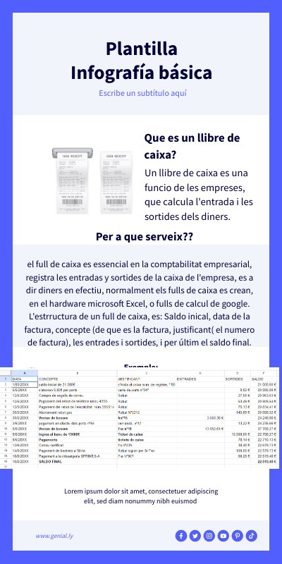 el full de caixa es essencial en la comptabilitat empresarial, registra les entradas y sortides de la caixa de l'empresa, es a dir diners en efectiu, normalment els fulls de caixa es crean, en el hardware microsoft Excel, o fulls de calcul de google. L'estrructura de un full de caixa, es: Saldo inical, data de la factura, concepte (de que es la factura, justificant( el numero de factura), les entrades i sortides, i per últim el saldo final.