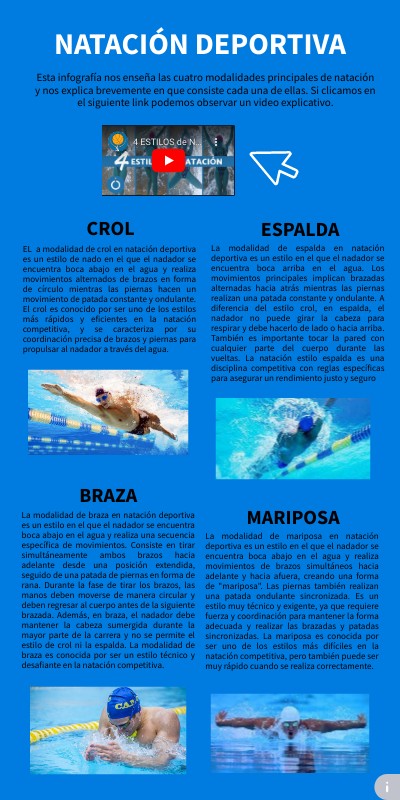 Esta infografía nos enseña las cuatro modalidades principales de natación y nos explica brevemente en que consiste cada una de ellas. Si clicamos en el siguiente link podemos observar un video explicativo.