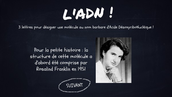Pour la petite histoire : la structure de cette molécule a d'abord été comprise par Rosalind Franklin en 1951