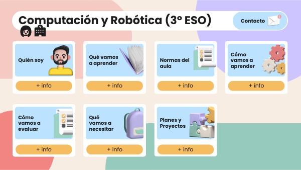 1.1. Comprender el funcionamiento de los sistemas de computación física, sus componentes y principales características. 1.2. Reconocer el papel de la computación en nuestra sociedad. 1.3. Entender cómo funciona un programa informático, la manera de elaborarlo y sus principalescomponentes. 1.4. Comprender los principios de ingeniería en los que se basan los robots, su funcionamiento, componentes y características. 1.5. Realizar el ciclo de vida completo del desarrollo de una aplicación: análisis, diseño, programación y pruebas.