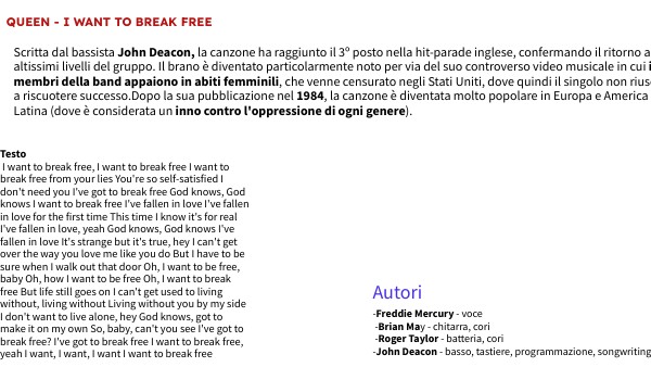 Testo I want to break free, I want to break free I want to break free from your lies You're so self-satisfied I don't need you I've got to break free God knows, God knows I want to break free I've fallen in love I've fallen in love for the first time This time I know it's for real I've fallen in love, yeah God knows, God knows I've fallen in love It's strange but it's true, hey I can't get over the way you love me like you do But I have to be sure when I walk out that door Oh, I want to be free, baby Oh, how I want to be free Oh, I want to break free But life still goes on I can't get used to living without, living without Living without you by my side I don't want to live alone, hey God knows, got to make it on my own So, baby, can't you see I've got to break free? I've got to break free I want to break free, yeah I want, I want, I want I want to break free