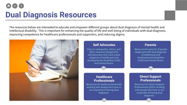 The resources below are inteneded to educate and empower different groups about dual diagnosis of mental health and intellectual disability. This is important for enhancing the quality of life and well-being of individuals with dual diagnosis, improving competence for healthcare professionals and supporters, and reducing stigma.