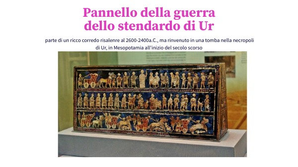 -British museum a Londra, 20x47 cm -materiale: legno intarsiato -prisma composto da pannelli lignei decorati a intarsio con conchiglie, madreperla e calcare rosso su un fondo di lapislazzuli