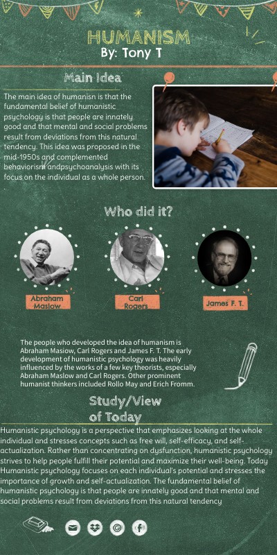 The main idea of humanisn is that the fundamental belief of humanistic psychology is that people are innately good and that mental and social problems result from deviations from this natural tendency. This idea was proposed in the mid-1950s and complemented behaviorism andpsychoanalysis with its focus on the individual as a whole person. .
