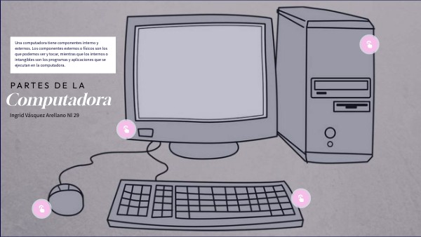 Una computadora tiene componentes interno y externos. Los componentes externos o físicos son los que podemos ver y tocar, mientras que los internos o intangibles son los programas y aplicaciones que se ejecutan en la computadora.