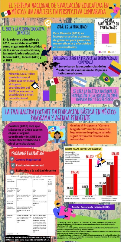 * Cordero, A., Luna, E., Patiño, A. y Xochilth, N. (2013). La evaluación docente en educación básica en México: panorama y agenda pendiente. Revista Electrónica Sinéctica, (41), 1-19. * Cursor en la noticia ,(2022). Dan clases entre inequidad salarial; Fondo de Nómina Educativa ha perdido 30 mil mdp. Recuperado de: https://www.cursorenlanoticia.com.mx/dan-clases-entre-inequidad-salarial-fondo-de-nomina-educativa-ha-perdido-30-mil-mdp/ * Miranda, F., Islas, J. y Fuentes, A. (2017). El sistema nacional de evaluación educativa en México: un análisis en perspectiva comparada. Congreso Nacional de Investigación Educativa. San Luis Potosí, México.